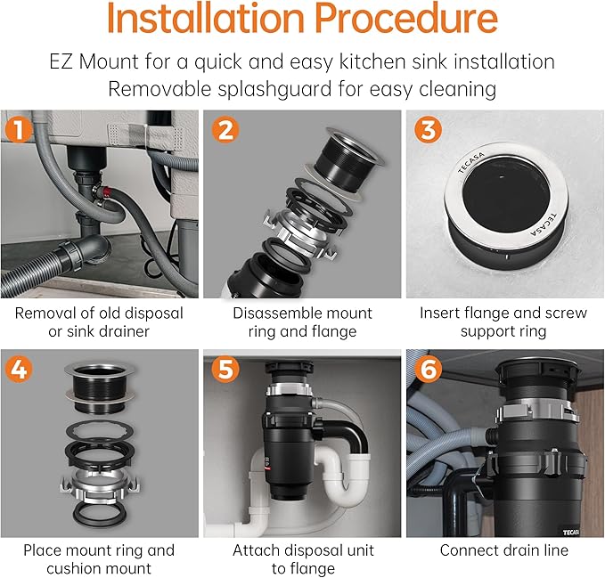 - SIMPLE INSTALLATION: The sink disposal features a compact size and mount design that fits most existing EZ mounting assemblies, making it easy and fast to install or replace. It's compatible with other popular brands.TECASA garbage disposal is suitable for most home kitchens for standard 3-1/2 inch sink opening hole. A pre-installed 39" power cord for electricity connection.