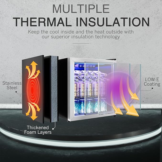 - [Refrigeration & Cooling Storage 2-in-1] I wanted to let you know that this wine cooler is pretty cool! It uses advanced air cooling technology that allows for 360° full-angle recirculated air duct cooling, which means that everything inside gets cooled evenly. Pretty neat, huh? You'll also appreciate the beautiful glass door with a low-e coating and a high density door seal that prevents cold air from escaping while blocking warm air from entering.